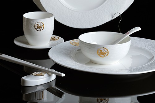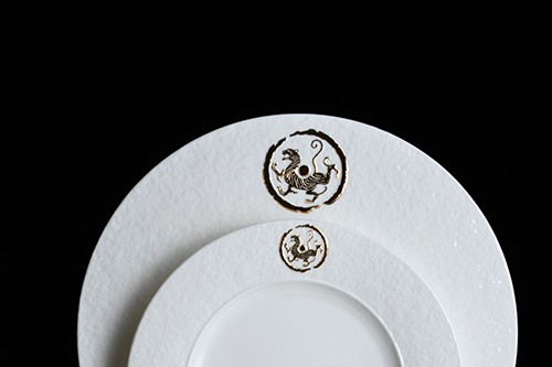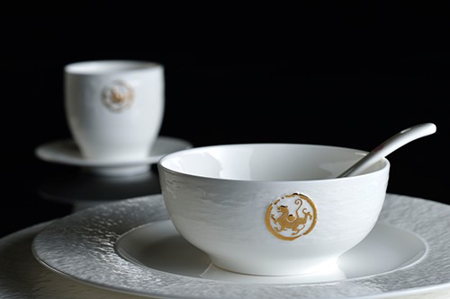 中國古代傳說中,四神獸為天之四靈,掌管天地四方,故王者宮殿喜用四獸為瓦,取平定四方之意?!痘茨献印吩疲骸拔鞣浇鹨?,其獸為白虎?!鄙瘾F白虎掌管西方,是正氣之神,有辟邪懲惡、招財納喜之意,多受達官貴人喜愛。本套作品創意來自漢代未央宮遺址出土的白虎紋瓦當,取其高貴威嚴之勢、古樸深遠之韻,虎躍玉間,平凡的餐具一躍成為尊貴高雅的象征,是彰顯大氣、耀顯尊榮的選擇。